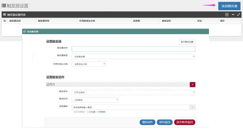 平台用户可依次填写触发器名称、类型、作用的地址分类,以及设置触发动作、时间范围等。