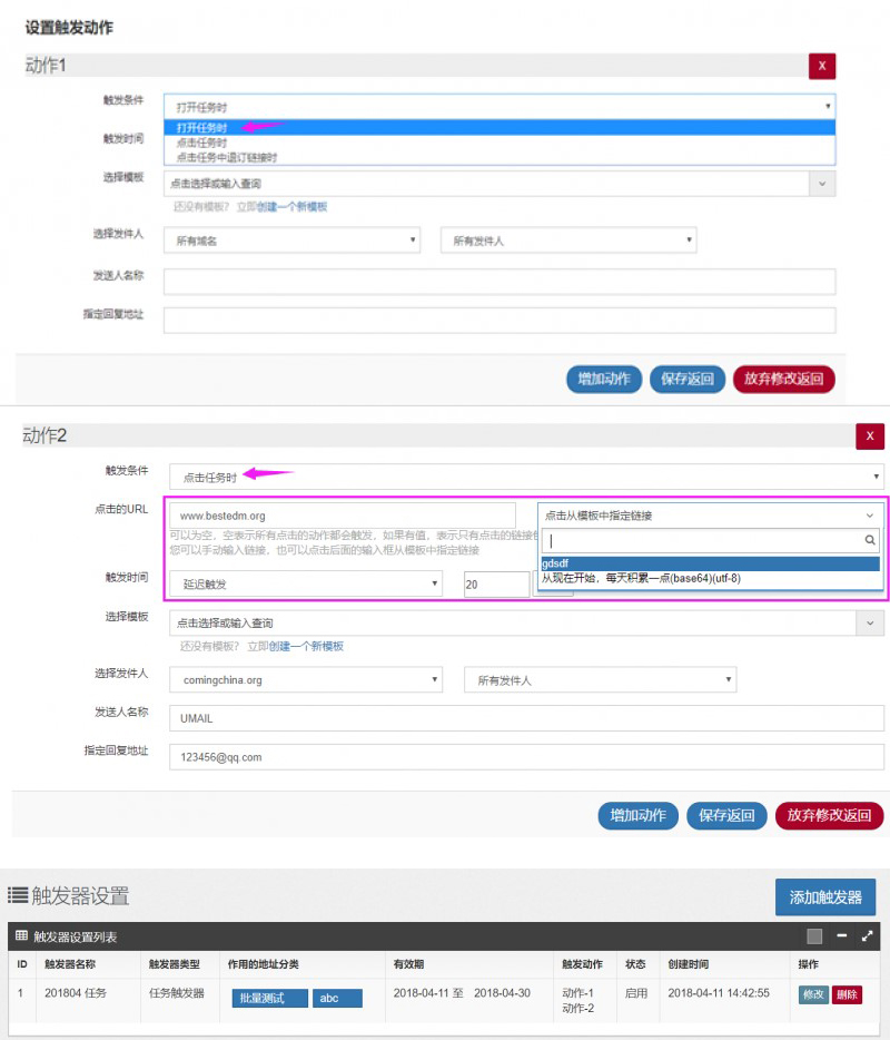 二、由营销人员在U-Mail邮件群发平台后台设置一系列动作,对应着客户的行为,到确定时间点,就激发。