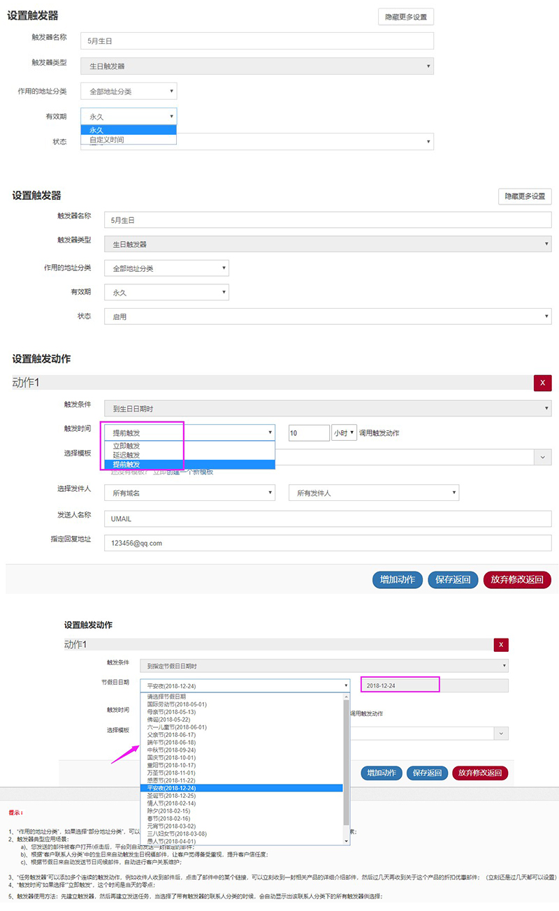场景二:设置节假日、生日等时间自动触发邮件,如下图所示:
