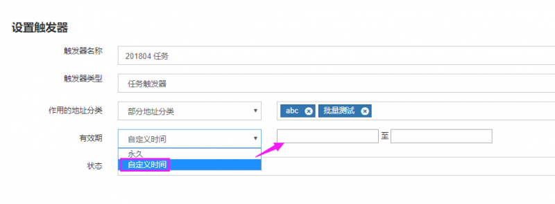 例如:2019-01-10至2020-01-10这个时间段内有效或触发器建立之日起X天内、永久有效