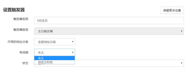 例如2019-01-10至2020-01-10这个时间段内有效或触发器建立之日起X天内、永久永久有效