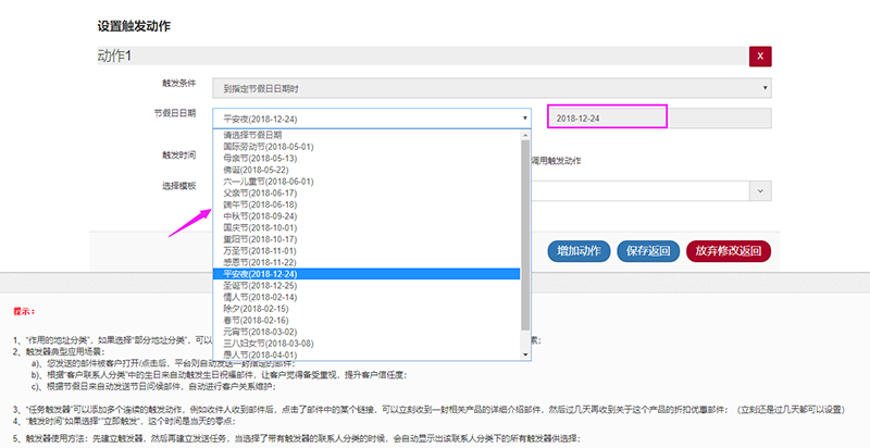 日期时间:邮件列表里的生日数据触发(可选时间字段)、节假日等数据触发