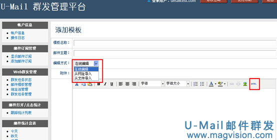 U-Mail邮件群发平台为公司量身定做邮件模板,支持公司将网址、文件和HTML代码导入并在线编辑,使邮件杂揉多种文件格式,限度的包容诸多元素,显得别具一格富有吸引力。
