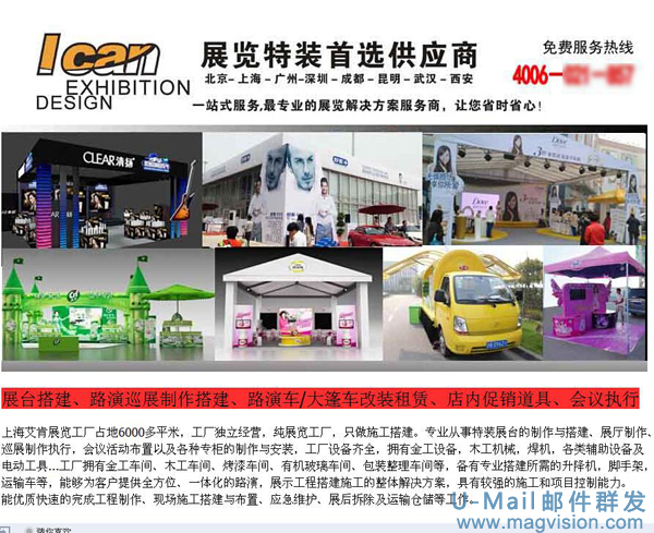 2.公司LOGO和自身鲜明特色定位“展览特装优选供应商”、热线电话打头阵,随后是公司服务内容和优势的具体介绍,文字简练而到位;