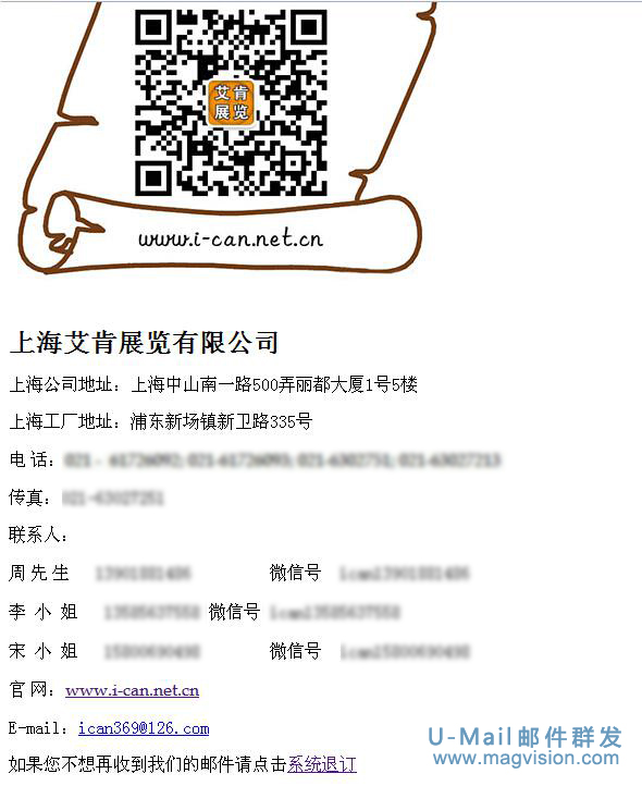 那么问题来了,如何获取对方信任从而作出“订阅”选择呢?U-Mail邮件群发平台新近一位用户——上海艾肯展览有限公司的经验值得借鉴。 它是一家专业集设计、制作、咨询策划为一体的综合性专业机构,为国内外企业参展布展提供一揽子解决方案。公司了解到邮件营销具有快捷即时、性价比高的优势,又亲自验证了U-Mail邮件群发平台稳定、高效的送达率“神迹”,决定将邮件群发作为重点推广手段。因此,公司无论在拜访客户,还是请潜在客户提供资料,或广发调查问卷时,都会要求对方邮件地址项显著标注出来,为此不惜略去其他选项(根据互联网的“极简”思维,快节奏社会,人们极其反感繁琐的程序),直到确认对方邮件地址准确无误,慎重的态度令客户为之耸容。