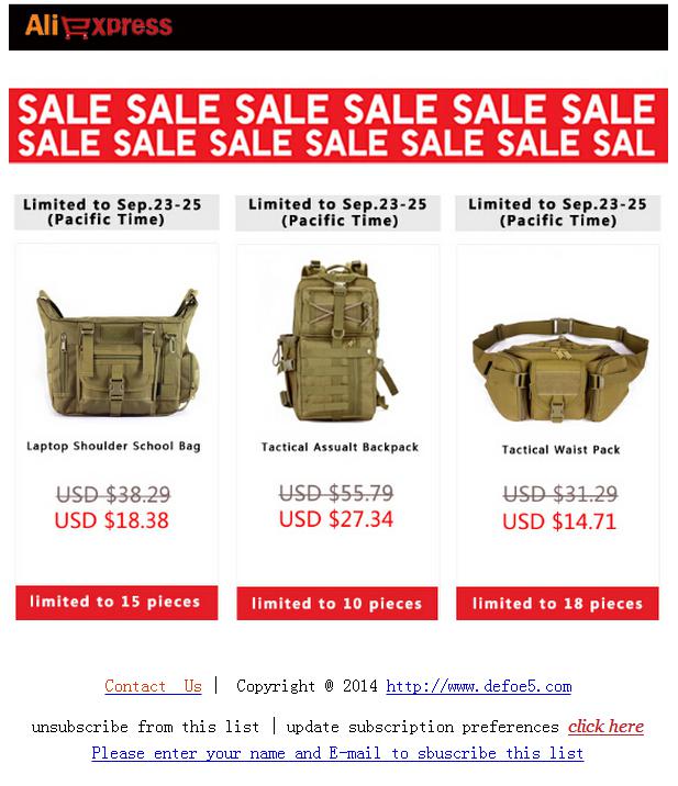 自然,能够给出吐血的促销价格是有一定时间限制的,群发邮件限定在“9月23-25日”,而每样产品剩余的件数也标注出来,给消费者强烈的暗示:再不下手,可就悔之晚诶!如此价廉物美的商品再往何处求?