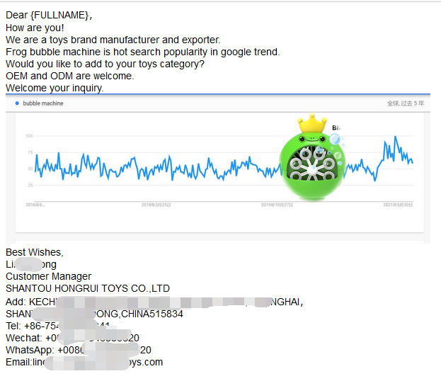 汕头市虹瑞玩具有限公司主要从事玩具和工艺礼品贸易,发展至今已成为一家集开发,生产,贸易于一体的专业型玩具企业,产品远销欧洲、美国、中东、东南亚等等国家。为了提高品牌在海外市场中的专业度,获取更多的海外订单,虹瑞玩具选择和U-Mail邮件营销平台合作,通过电子邮件发送外贸开发信的方式来开拓海外市场,经过2个多月的合作,虹瑞玩具目前月发送量已经突破了十万封。