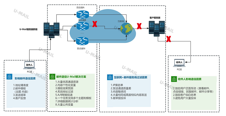 邮件群发在现代营销中扮演着重要角色,但要确保邮件成功送达收件人的收件箱,需要注意多个因素。从发件人、互联网+客户服务器邮件过滤到收件人反馈,每个环节都可能对最终效果产生重要影响。本文针对这些影响因素的详细分析,以及U-Mail邮件群发平台和发件人如何解决相关问题的策略: