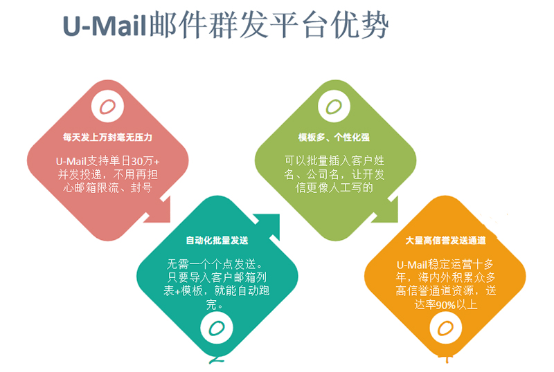 U-Mail稳定运营十多年,积累众多高信誉通道资源,海内外都有专门的群发通道,送达率90%以上