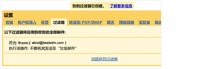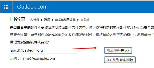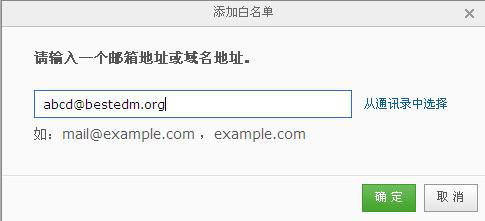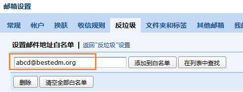 【答】为了确保您的邮箱能够不错过任何一封您订阅的邮件通知,我们强烈建议您在邮箱中把我们的邮箱地址设置在"白名单"中。"白名单"是您的安全名单,加入"白名单"中的地址或域的邮件,将不会被当作垃圾邮件过滤。假如您订阅的是abcd@bestedm.org邮箱群发的邮件,各种邮箱白名单设置方法如下: