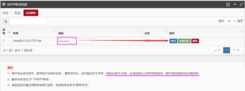 在平台开通的发件人密码是随机设置的,用户可自行对其修改,把原有密码删掉重置即可。公共域名、独立域名的操作方法一样。