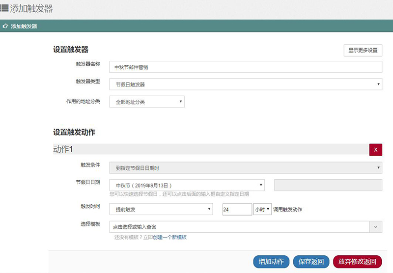 像U-Mail邮件营销平台的触发器功能,可以设置节日触发或者生日触发,提前设置好群发邮件内容,到节日或生日时间就会自动群发邮件。