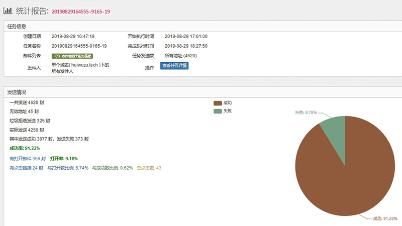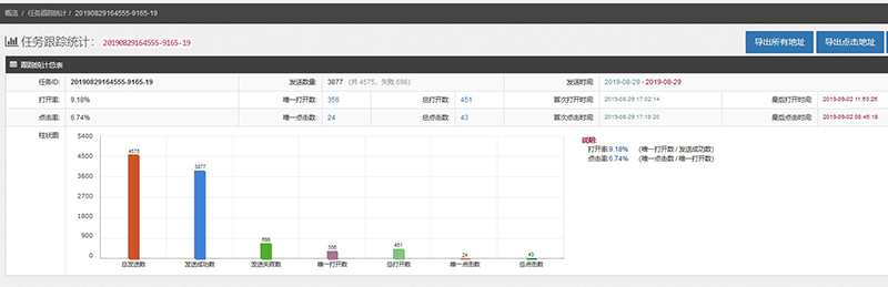 可以完整跟踪发出去的每封邮件, 可以查看邮件发送率、点击率、IP地址、链接是否点击等各种数据,并且会根据营销活动数据生成详细的统计报告,方便下一步营销工作!