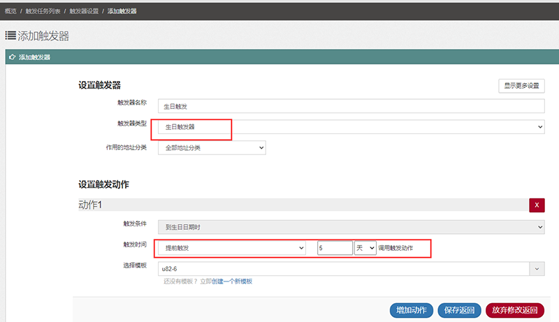 用户也可以利用U-Mail邮件群发平台的触发器功能进行触发发送,触发器可以设定客户的生日为触发条件,在客户生日那个月份或生日前几天给客户发送生日邮件。