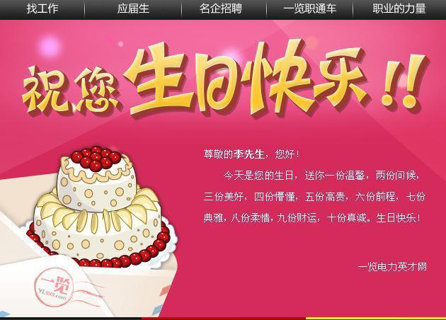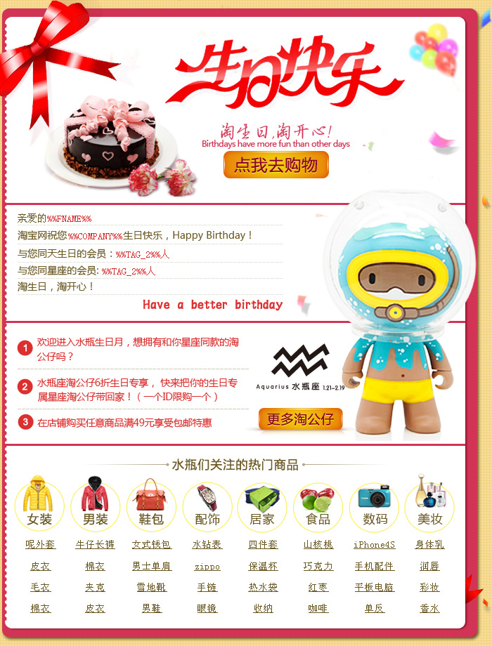 这是淘宝网给客户发送的一封生日祝福邮件,这封邮件设计上分为了三部分,第一部分首先是大大的中文“生日快乐”,让人一打开邮件就感受到生日的祝福,第二部分是祝福语和生日优惠券,关怀客户的同时也刺激了客户的消费,第三部分是根据收件人的属性,罗列出一些比较热销的商品,引导客户选择喜爱的商品。