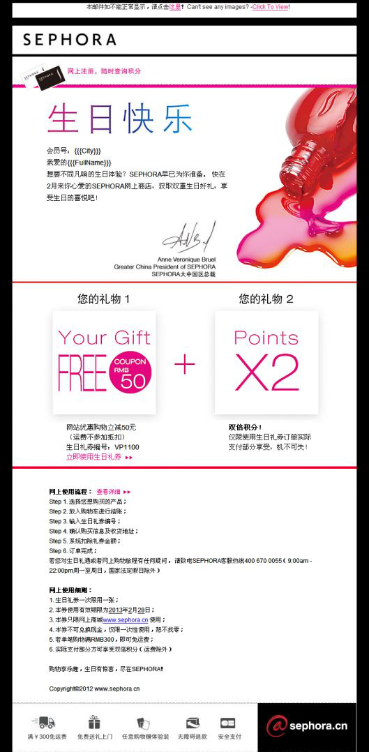 这封邮件设计的比较简约,色彩绚丽的“生日快乐”这个大字,引人注目。在邮件中企业不仅为客户提供50元的生日礼券,还能享受双倍积分的,双重的优惠叠加,更加吸引用户。生日礼券的使用流程和细则,展现出企业人性化的服务理念。