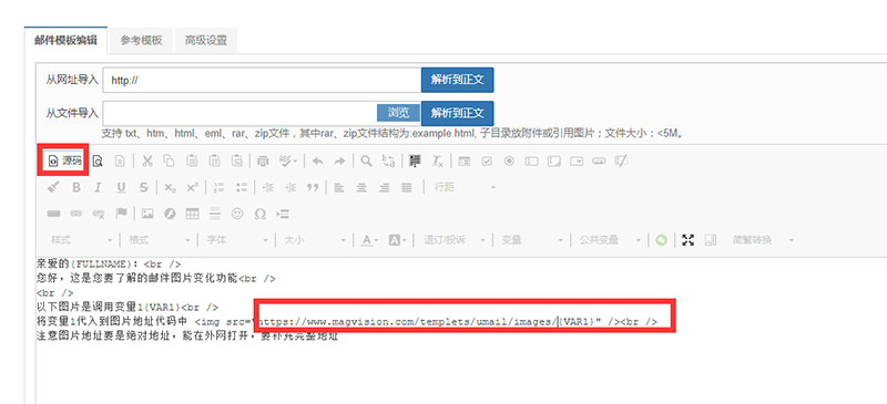 邮件内容中设置好对应变量,如姓名、性别等。图片地址调用需要点击源码,在源码中添加以下代码<img src="图片目录地址/{VAR1}" >