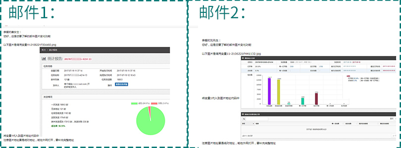 群发测试之后可以看到两封邮件图片都是不一样的,文字中有添加姓名的变量,其他文字变量也可以调用。