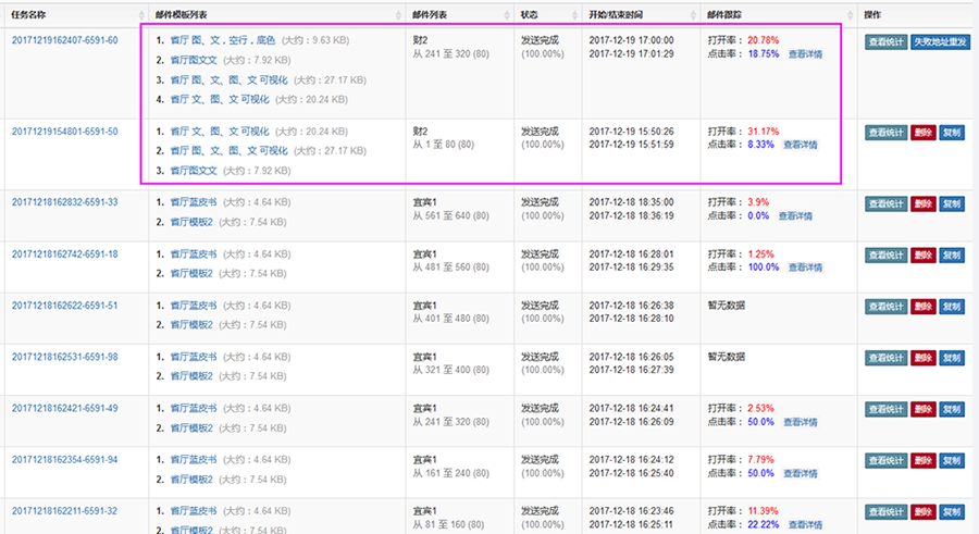 在U-Mail邮件营销平台诸多给力措施加持下,公司的调查问卷发送效果非常理想,特别是增加了每次任务的邮件模板列表后,数据越来越漂亮,如下图所示: