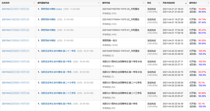 天科人才邮件群发发送效果很好,成功率99%以上,打开率也基本上是95%以上,效果统计如下: