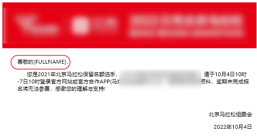 由于北京马拉松组委会为所有获得2021年北京马拉松参赛资格的选手保留了2022年的参赛名额,但保留名额的选手必须在规定时间内完成报名。因此,在赛事开始之前,组委会就通过U-Mail邮件营销平台给保留名额选手发送报名通知邮件,告知其如何提交报名资料,在策划报名通知邮件时采用了单栏排版模式,这种排版模式图片、文案等主要元素成单列纵向排列,给人的感觉相对正式、稳定。并在邮件正文中插入了姓名变量,参赛者收到邮件时就会变成他的姓名。
