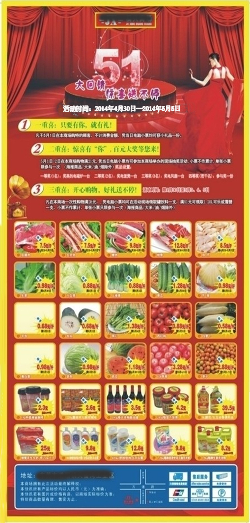 2.以红色帷幕拉开暗示“购物嘉年华”这一场喜庆活动即将盛大登场,“51”字样珠光宝气璀璨夺目,后面阿拉伯数字“1,2,3”讲述三重“惊喜”,简洁明了,引人入胜;右上角的“拖地长裙美女”和左边的小“喇叭”点缀非常配景。