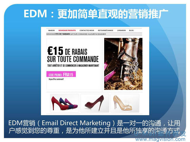 3.定期制作精美的商品海报,季末或节假日举行打折优惠等活动,图文并茂,甚至借助GIF动画,使群发邮件极富视觉冲击力,带给顾客审美享受,其中不乏一些时新的元素;而在每个购物季结束之际,公司会将当季度热卖的各类商品、消费者口碑佳的商品、与同行对比性价比优的商品等一一总结出来,群发邮件给消费者。
