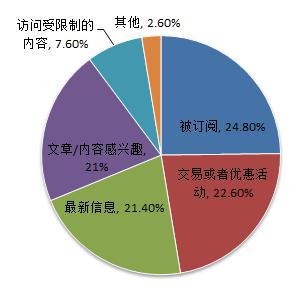 从上图可知:接近四分之一的人认为自己是“被订阅”的,常见的是访问网站、注册用户、购买商品时不知不觉接受的一些条款中隐含了“订阅邮件”。另外接受订阅邮件的客户中,有一部分是对文章/内容感兴趣,有一部分是想看到信息,另有一部分消费者想了解交易或者公司的优惠活动,可见,有超过60%的消费者订阅邮件目的性非常强,即了解公司、行业、商品、服务相关的信息。如果我们能成功的让前面25%的“被订阅”用户了解自己接收邮件的必要性和实用价值,那么累加起来,就非常可观。