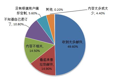 既然我们知道消费者的兴趣所在,那么为何我们的邮件邮件效果并不理想呢?消费者退订的原因又有哪些?这个问题,同样有权威媒体给出了答案,如下图: