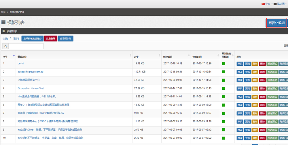 具体操作是:登录后台,选择“邮件模板管理”命令,在右边的“模板列表”中,我们勾选一个模板,或引入新的模板后,点击“可视化编辑”按钮,如下图: