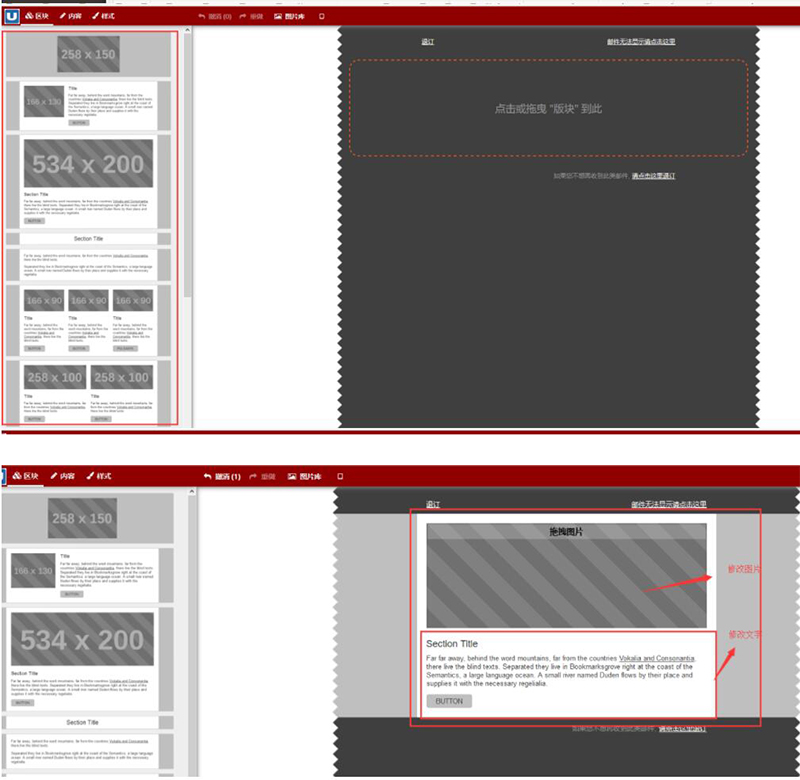 这个编辑过程是非常简单轻松的,如下图所示的对话框中,左边有不同类型的排版形式,用户可以根据自己的需要,用鼠标轻松拖动控件,就可以添加到右边,实时修改文字和图片,终生成理想的模板,类似于“傻瓜相机”的发明为广大摄影爱好者即使是入门级的,都带去了很大的便利,而U-Mail邮件营销平台也会给一些营销人员创造出简单写意的效果。
