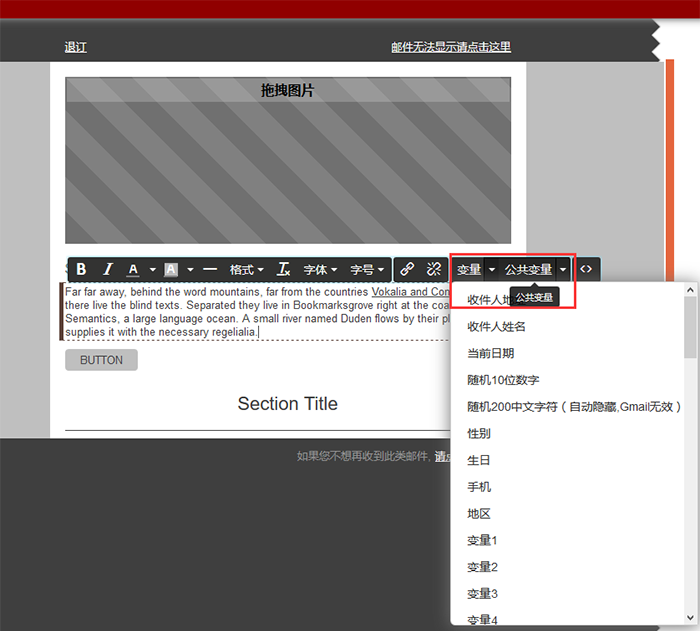 此外用户还可以在这个邮件模板中轻松自如的添加各种变量,包括常用到的公共变量库和用户自定义设计的变量,如下图所示: