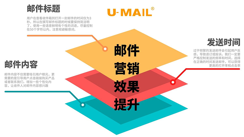 虽然目前企业使用邮件作为营销推广工具已非常普遍,但不同企业运用的方式、推广内容甚至是推送时间不同,往往效果也有很大区别。所以,要想做好EDM邮件营销,其中有很多方法及技巧是需要我们注意的,下面就有U-Mail邮件营销平台为大家一一讲解。