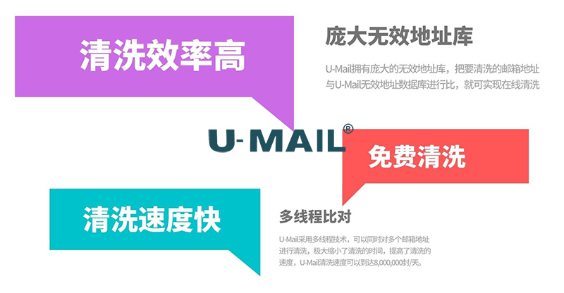 U-Mail邮件营销平台拥有庞大的无效地址库,把要清洗的邮箱地址与U-Mail无效地址数据库进行比,就可实现在线清洗,从而提高清洗的效率。并且还与腾讯进行了技术合作,U-Mail可以通过技术手段实现直接在腾讯清洗无效QQ邮箱地址。